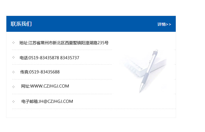 地址:常州市新北區友邦商務大廈1幢16、17層  電話:0519-85101652  傳真:0519-85112595  郵編:213022  網址:www.cz-jiayue_cn.qzwanming.com  郵箱:xiajifengaa@163.com